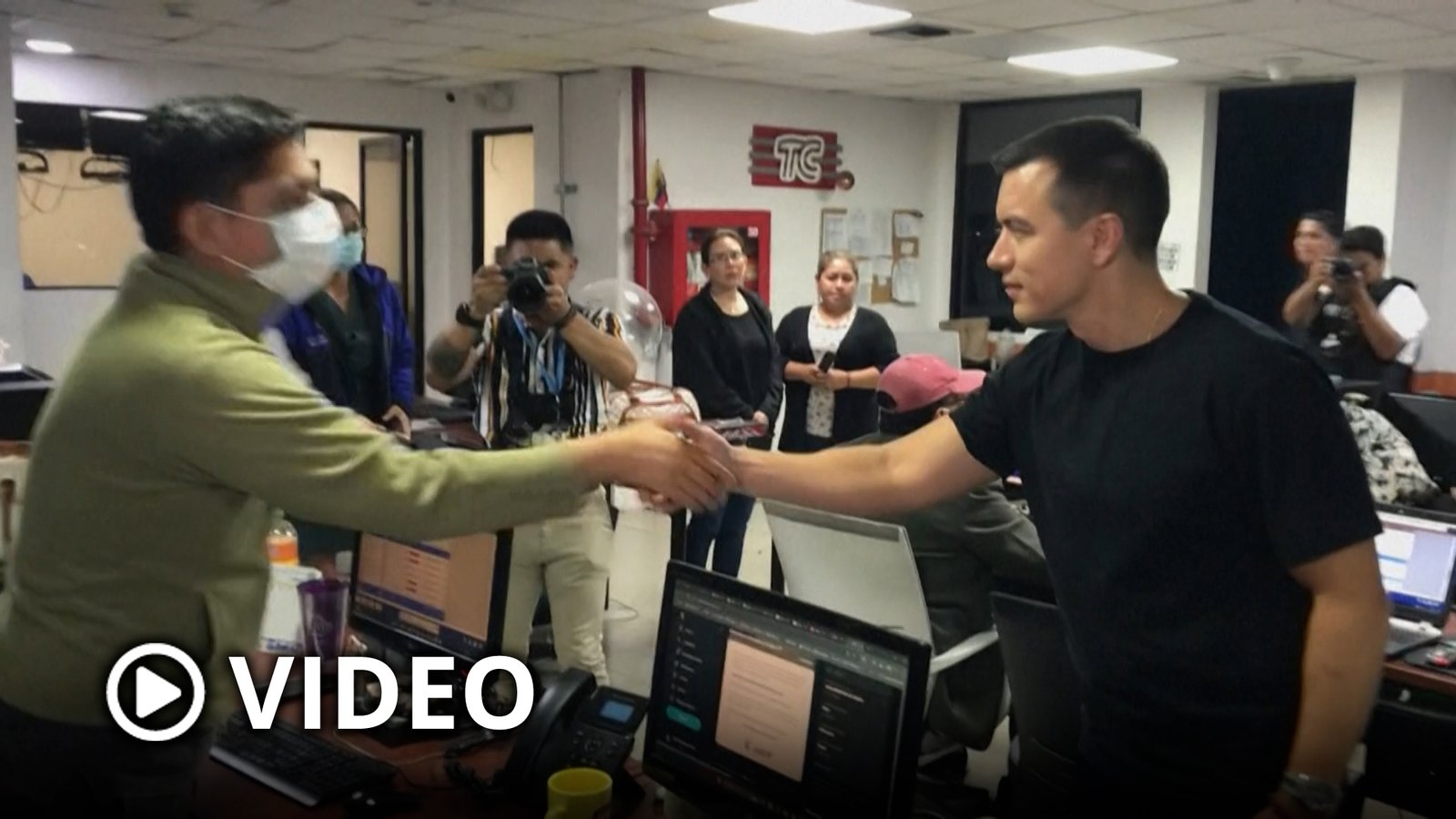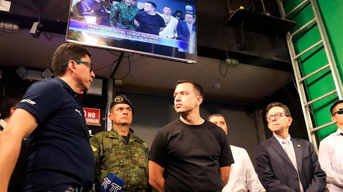 El presidente de Ecuador, Daniel Noboa, recorrió este viernes las instalaciones de TC Televisión, uno de los medios públicos más importantes del país, que el último martes fue tomado por una banda armada en el marco de la ola de violencia desatada por sectores vinculados al narcotráfico y al crimen organizado.