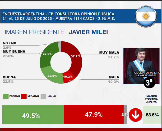 La misma medición que otorga una imagen positiva del 49,5% a Javier Milei en Argentina, indica también que el 47,9% tiene una imagen negativa, donde el 37,7% eligió la opción Muy Mala para expresarse sobre el presidente. Según la encuesta la percepción positiva en favor del presidente argentino bajó cuatro puntos, en el mes anterior había sido de 53,5%.