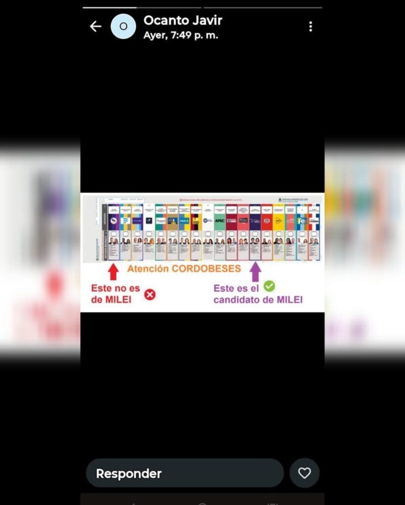 En una de las capturas puede leerse que una persona le preguntaría a Agustín Galetto “a quien hay que votar: “hola al león (con un emoji)”, habría respondido el joven. (…) “Por eso sos el mejor, me decís en qué escuela voto”, le responde esta persona. Por su parte, Javier Ocanto, Secretario de Salud, compartía en sus estados de WhatsApp imágenes de Milei y sobre cómo votar a la lista que encabezaba Roca en Córdoba, para que haya confusiones con la lista del Partido Libertario de Agustín Spaccesi.