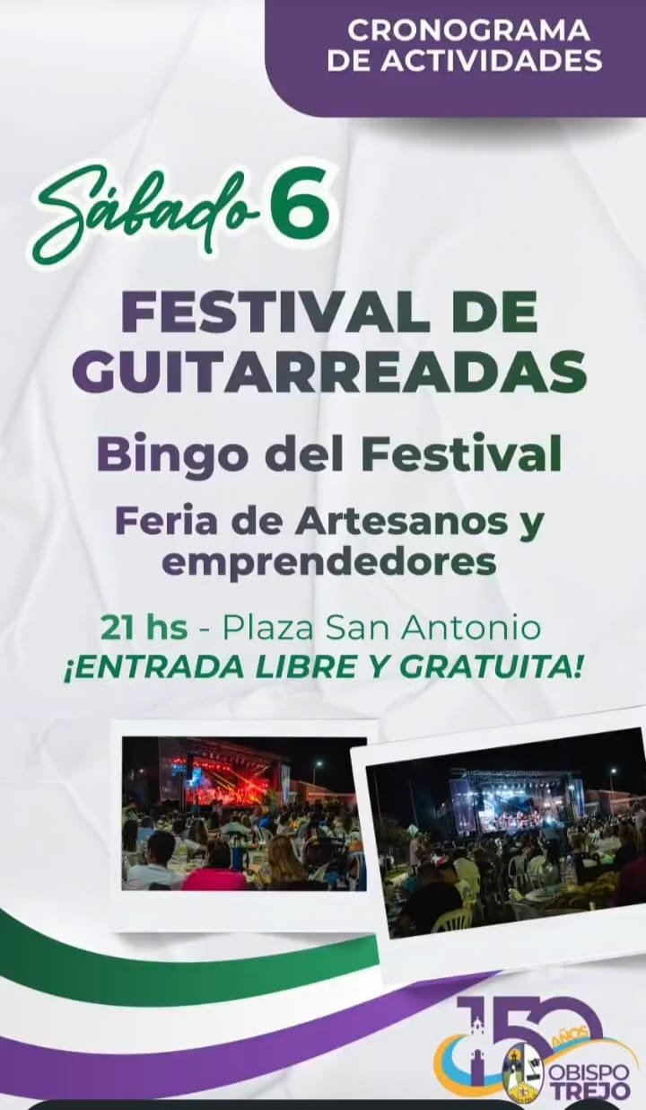 Obispo Trejo, una de las localidades con mayor crecimiento del Departamento Río Primero, cumple 150 años desde su fundación y se preparan para un fin de semana con importantes festejos. Este sábado 6 se hará el tradicional Festival de Guitarreadas, que además tendrá el «bingo del festival» y habrá feria de Artesanos y emprendedores. De acuerdo a lo informado por el municipio se espera a la gente a las 21hs en la Plaza San Antonio y la entrada es libre y gratuita.
