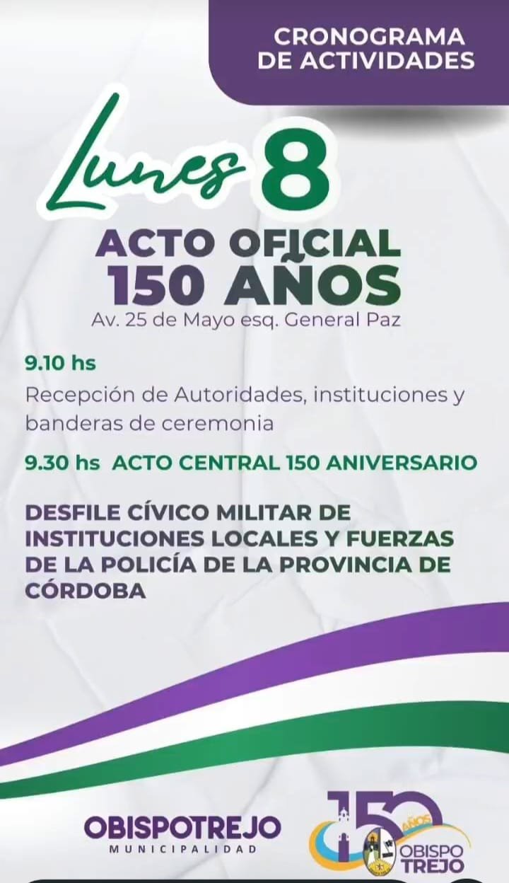 El día lunes 8 será el acto oficial por los 150 años de la localidad en la esquina de 25 de Mayo y General Paz. Se espera la llegada de importantes autoridades provinciales y no se ha descartado la presencia del Gobernador Martín Llaryora. El acto central será a partir de las 9:30hs que tendrá un desfile cívico militar de instituciones locales y fuerzas de la policía de la Provincia de Córdoba.