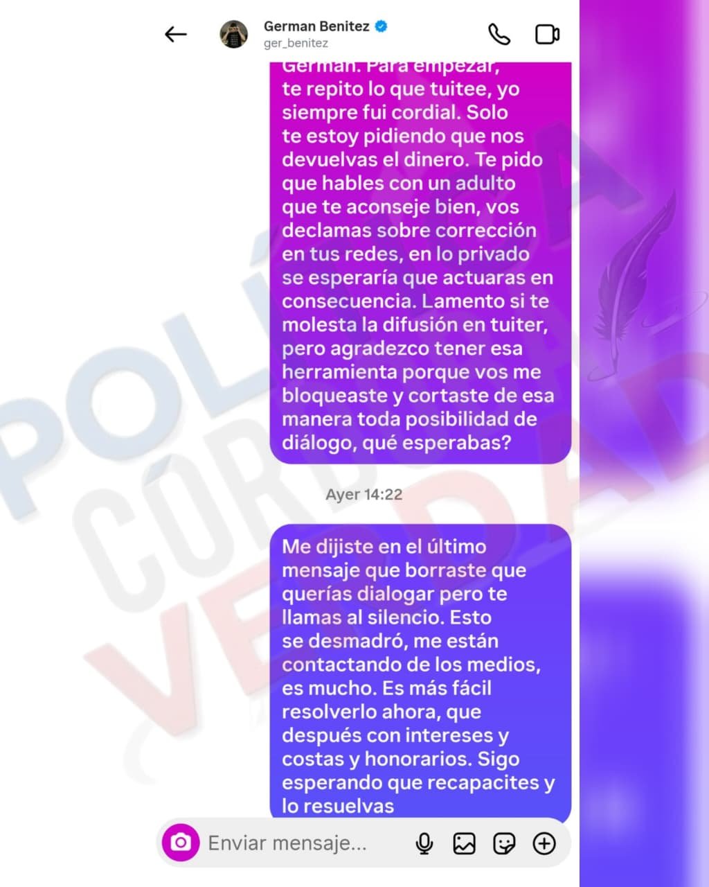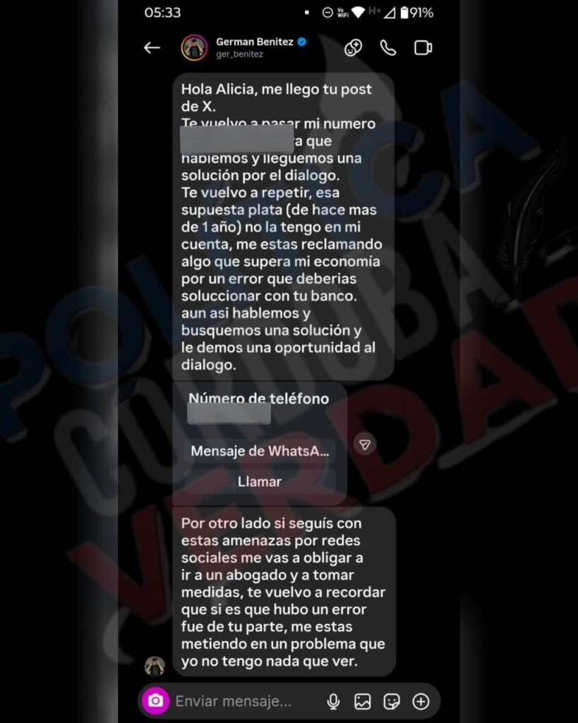 Nuestro medio accedió en exclusiva a la conversación que ambos tuvieron, antes de que Benitez la bloqueara, en la que el muchacha le pasa su teléfono para hablar y llegar a una solución. “Me estás reclamando algo que supera mi economía por un error que deberías solucionar con tu banco”, se lee en el chat. Además, Benitez le advierte que si ella “sigue con las amenazas” por redes, él se verá obligado a acudir a un abogado porque “si es que hubo” un error fue por parte de la mujer.