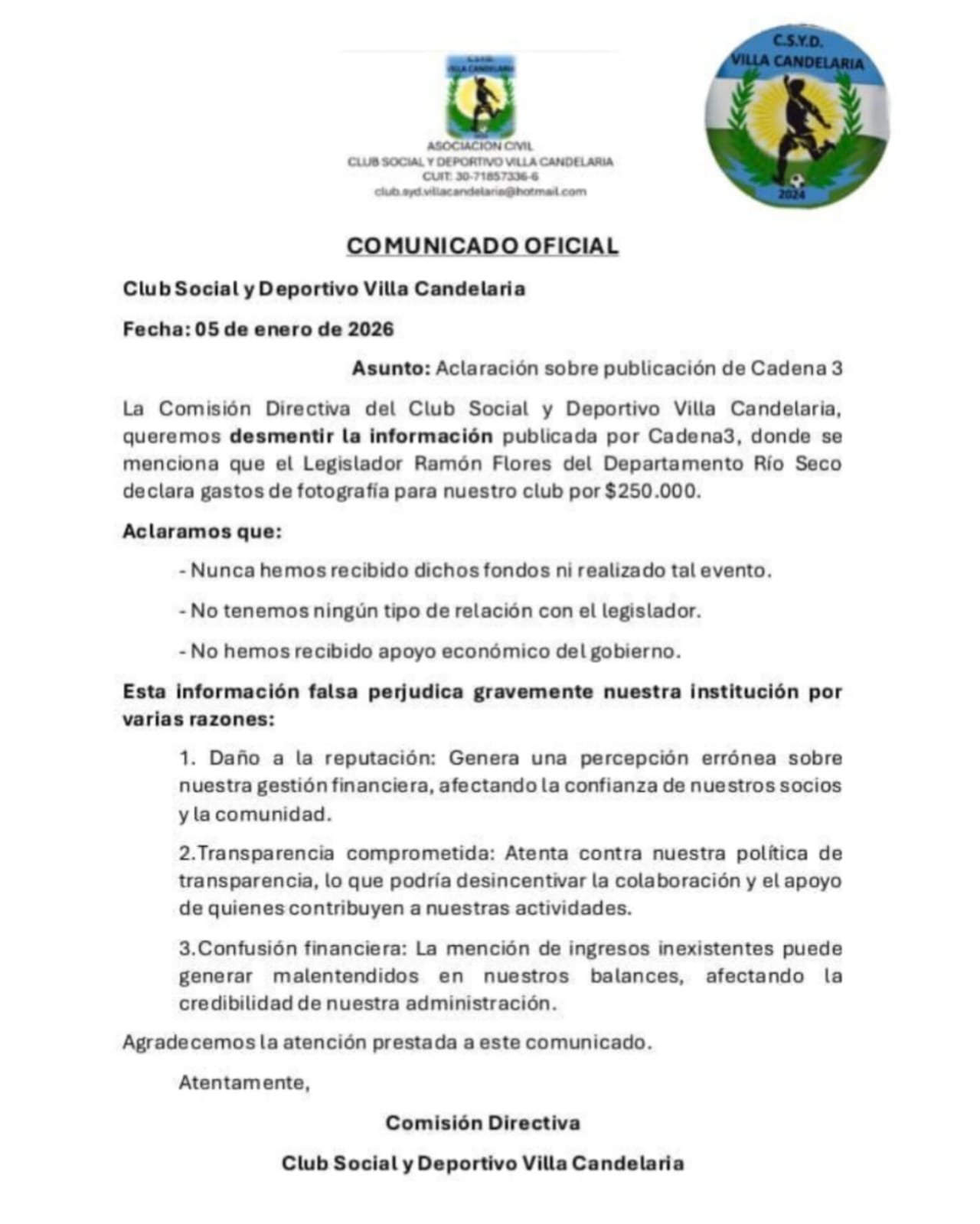 El escándalo por los reintegros que pidió el legislador Ramón «Cañito» Flores sigue escalando y se van conociendo detalles que contradicen las explicaciones que dio el representante del Departamento Río Seco a raíz de esta situación. Al comunicado de la Liga Regional Norte dónde desmienten a Flores y dicen no haber recibido ningún aporte del funcionario, ahora se suma la Municipalidad de Villa de María de Río Seco.