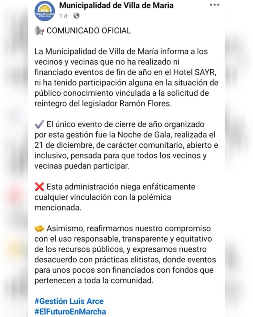 «La Municipalidad de Villa de María informa a los vecinos y vecinas que no ha realizado ni financiado eventos de fin de año en el Hotel SAYR, ni ha tenido participación alguna en la situación de público conocimiento vinculada a la solicitud de reintegro del legislador Ramón Flores. El único evento de cierre de año organizado por esta gestión fue la Noche de Gala, realizada el 21 de diciembre, de carácter comunitario, abierto e inclusivo, pensada para que todos los vecinos y vecinas puedan participar. Esta administración niega enfáticamente cualquier vinculación con la polémica mencionada», dice el comunicado.