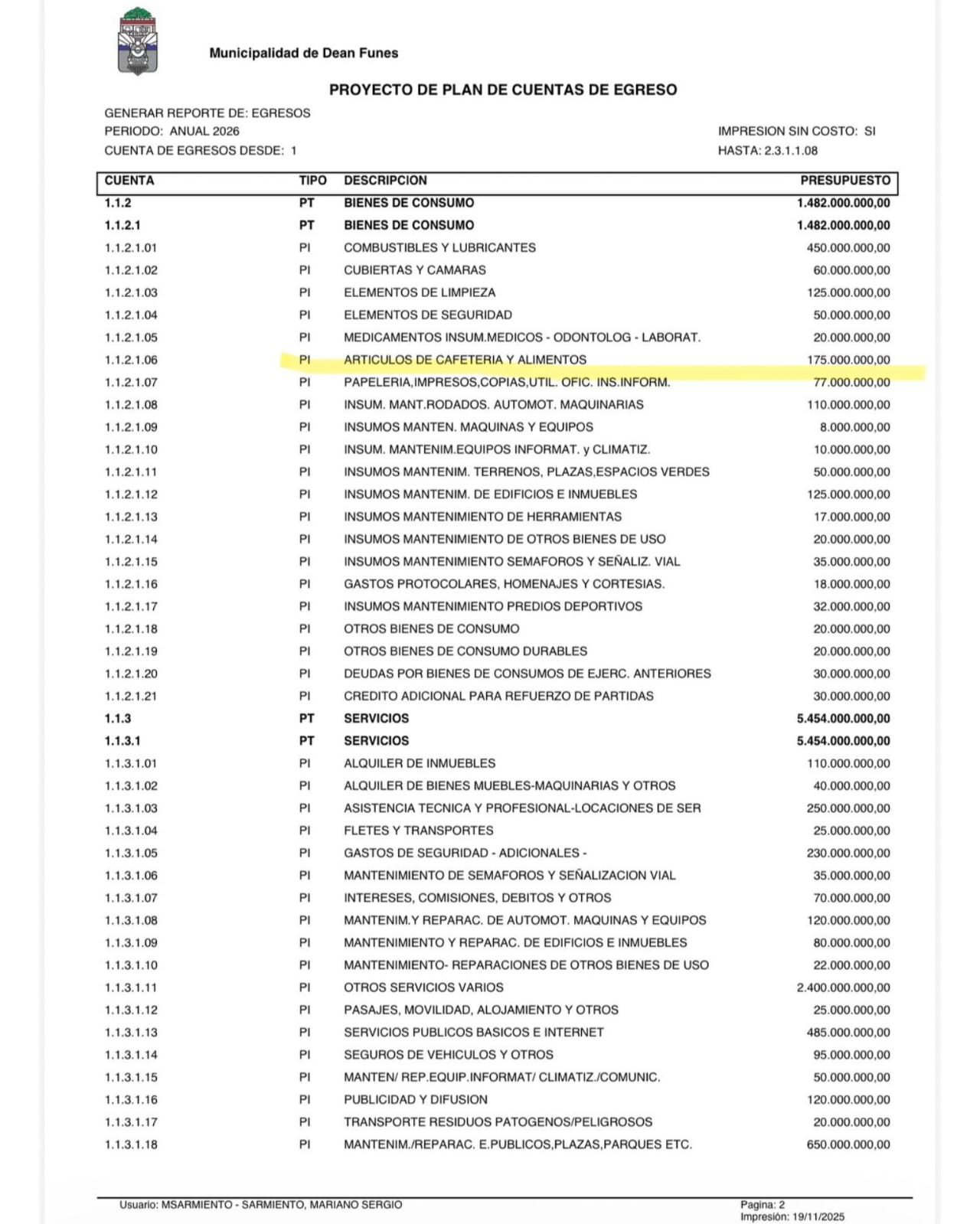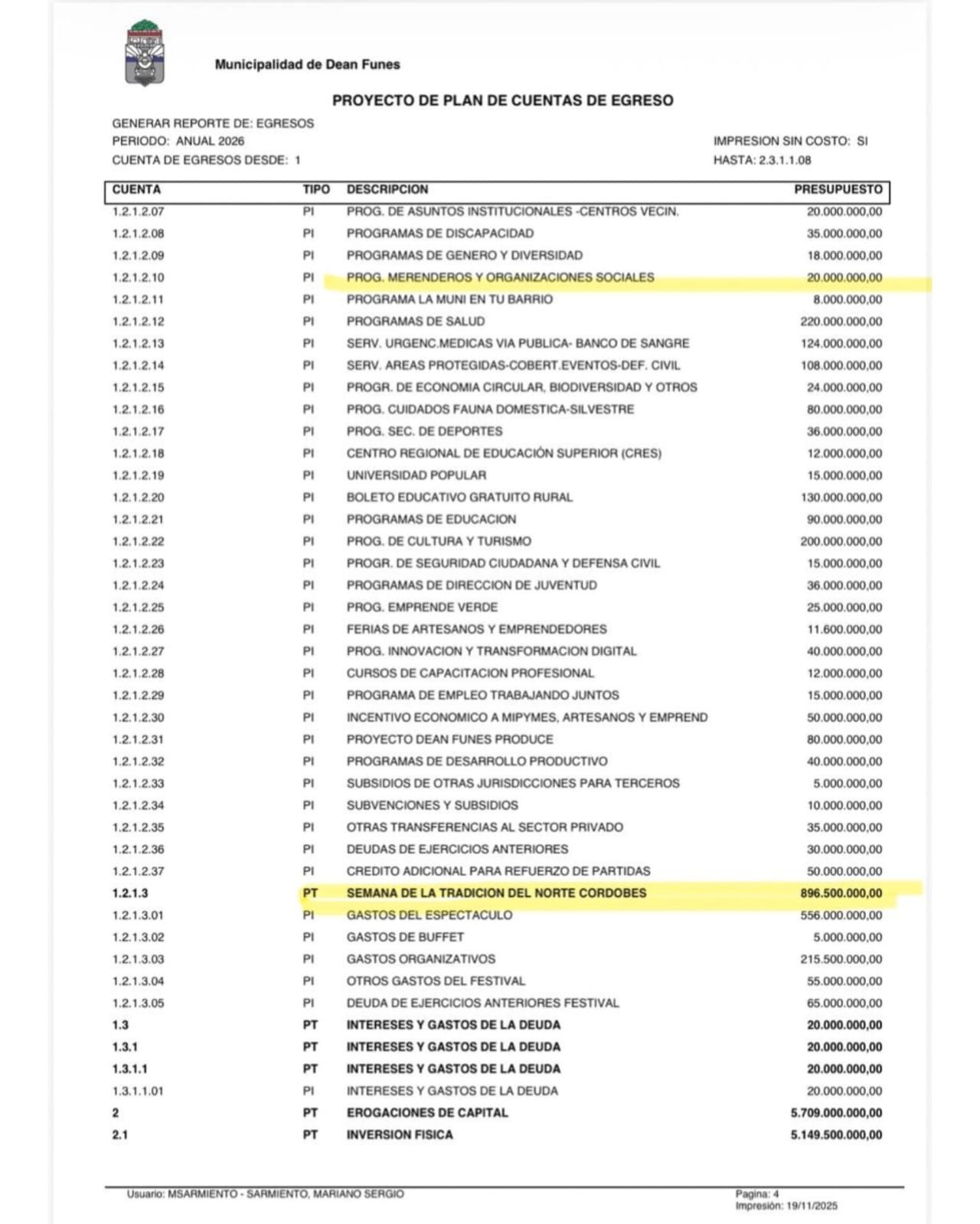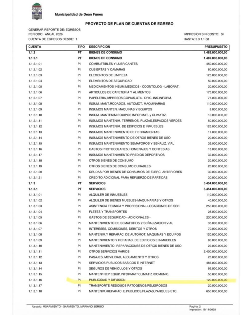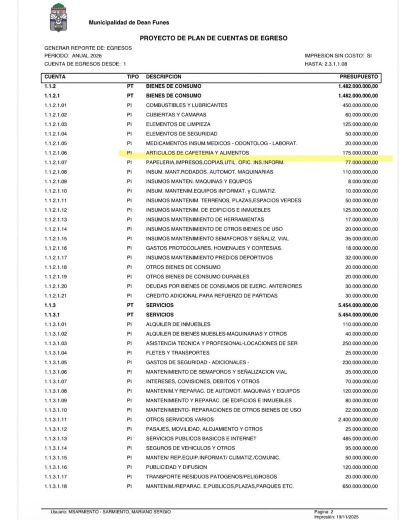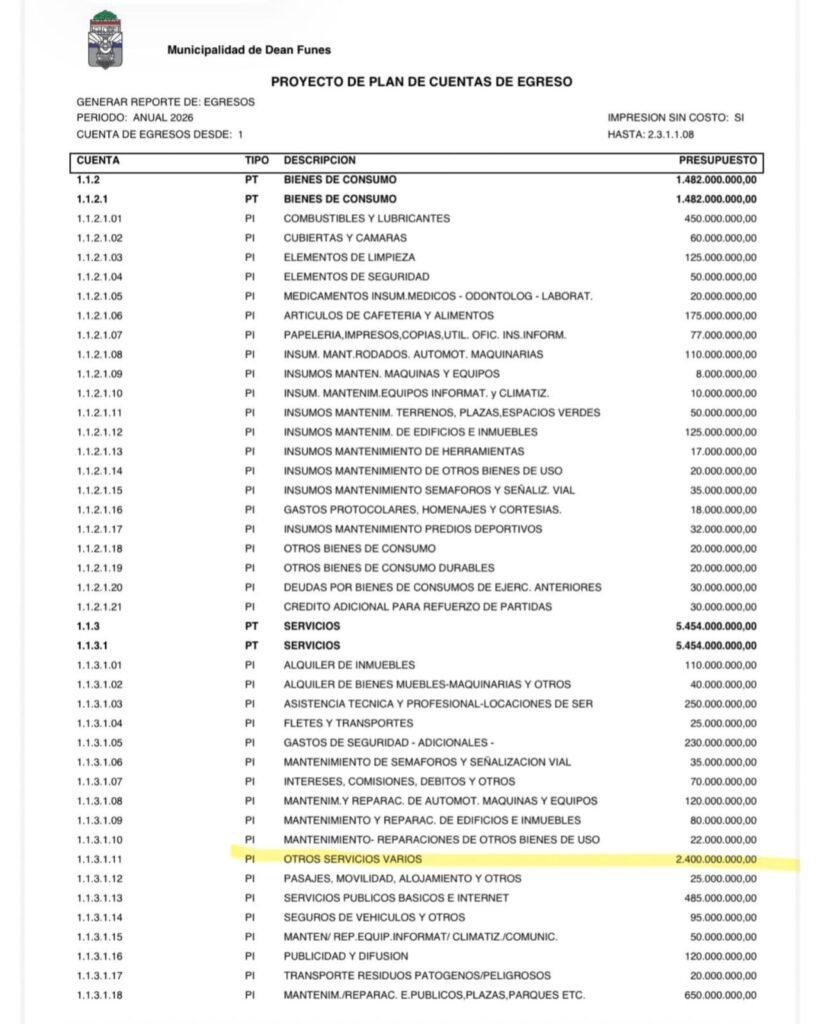 De acuerdo al plan de cuentas de egreso, se gastarán 175 millones en cafetería y alimentos. El otro ítems que generó dudas y polémica tiene que ver con “otros servicios varios”, por un monto de 2.400 millones de pesos. Las críticas no se terminaron allí, puesto que para los programas de merenderos y organizaciones sociales se gastarán 20 millones y para la semana de la tradición del norte cordobés, casi 900 millones.