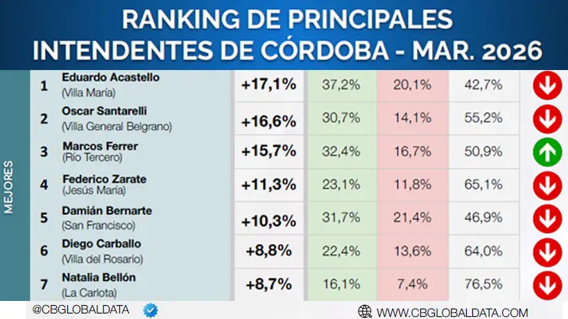 En el extremo opuesto, el podio de mejores diferenciales de imagen lo encabeza Eduardo Acastello, intendente de Villa María, con +17,1% (37,2% positiva, 20,1% negativa). Lo siguen Oscar Santarelli de Villa General Belgrano (+16,6%) y Marcos Ferrer de Río Tercero (+15,7%).