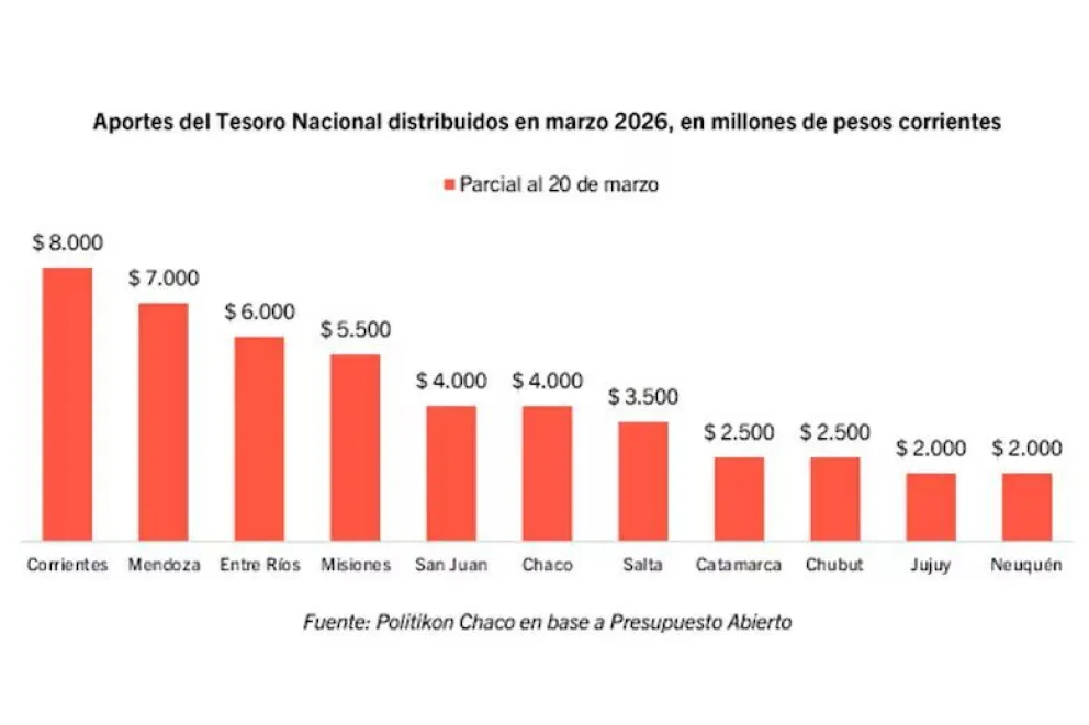 En el acumulado anual, Corrientes ratifica su posición como la jurisdicción más favorecida al sumar $14.000 millones totales (tras recibir $3000 millones entre enero y febrero). Misiones ocupa el segundo lugar con $9500 millones acumulados y Salta el tercero con $7500 millones. El listado anual se completa con Mendoza ($7000 millones), Chubut ($6500 millones), Entre Ríos ($6000 millones), Jujuy ($5000 millones), mientras que San Juan, Santa Cruz, Chaco y Neuquén totalizan $4000 millones cada una, cerrando Catamarca con $2500 millones.